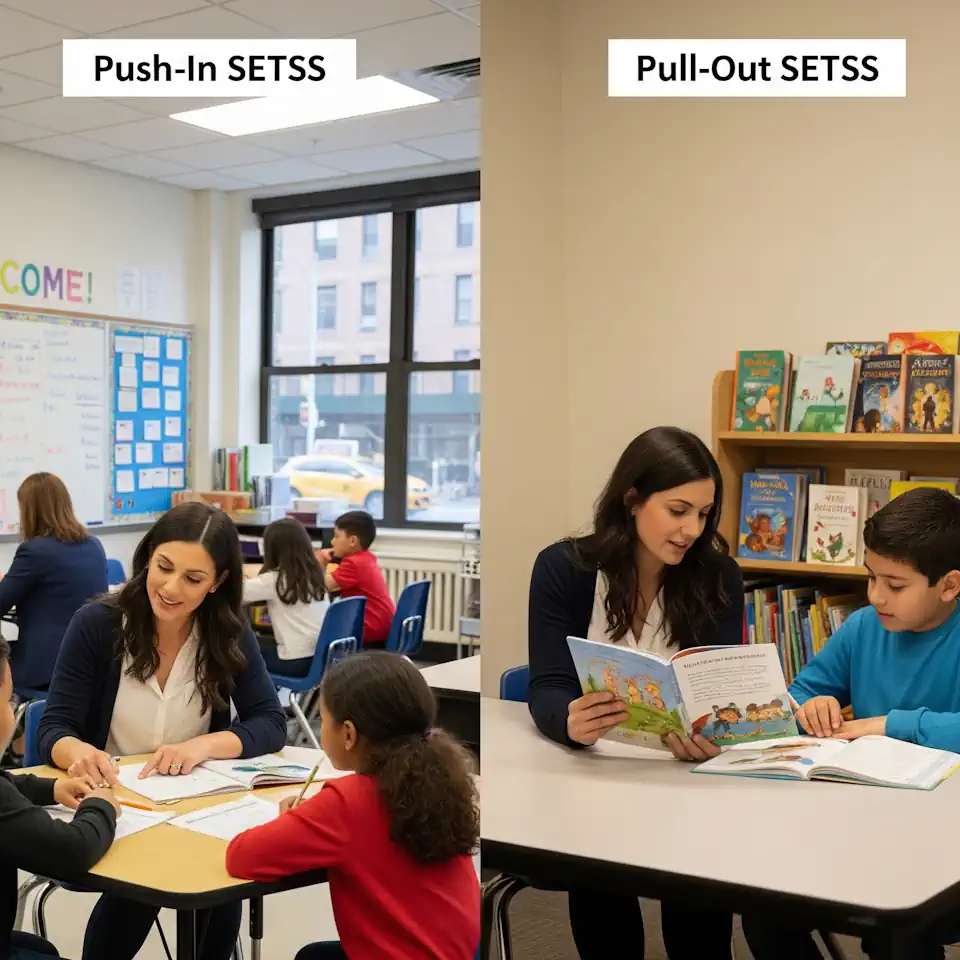 What Are Push-In Services? Push-in Special Education Teacher Support Services (SETSS) occur when a licensed special education teacher provides instruction within the general education classroom. Instead of being pulled out, the student remains with peers while receiving individualized support. When Do Push-In Services Work Best? Push-in services are especially effective when: A student can follow the general curriculum with targeted assistance. Collaboration between the classroom teacher and SETSS provider enhances instruction. Social inclusion and peer modeling are important for the child’s development. Who Receives Push-In Support? Students with Individualized Education Programs (IEPs) who need extra help but can succeed in a general education classroom often receive push-in services. Common areas of focus include reading comprehension, organization, and classroom participation. Benefits of Push-In Services Inclusion: The child learns alongside peers in a natural classroom setting. Collaboration: Teachers coordinate strategies for consistency. Confidence: Students avoid stigma by staying in class. Practical Application: Skills are reinforced immediately during lessons. Limitations of Push-In Services Less individualized attention compared to small pull-out groups. Classroom distractions may interfere with instruction. Teachers must manage roles carefully to avoid overlap or confusion. How Push-In Supports Overall Learning Push-in services allow students to access the general curriculum while still receiving specialized support. They promote inclusion, confidence, and independence, helping students thrive without isolating them from peers. What Are Pull-Out Services? Pull-out Special Education Teacher Support Services (SETSS) take place when a student leaves the general education classroom to work in a smaller group or one-on-one with a special education teacher. This environment provides targeted instruction away from classroom distractions. When Do Pull-Out Services Work Best? Pull-out services are most effective when: A student requires focused attention to learn specific skills. The general classroom environment is too overwhelming. Intensive instruction is needed to catch up in reading, writing, or math. Who Receives Pull-Out Support? Students with IEPs who need direct, specialized instruction that cannot be fully provided in the classroom benefit most from pull-out services. Benefits of Pull-Out Services Personalized Instruction: Tailored to the child’s unique learning style. Reduced Distractions: Small settings allow for better focus. Skill-Building: Ideal for teaching foundational skills. Confidence Growth: Students can practice without pressure from peers. Limitations of Pull-Out Services Students may miss portions of classroom instruction. Can create a sense of separation from peers. Requires careful coordination to prevent gaps in learning. How Pull-Out Supports Overall Learning Pull-out services provide the intensive, individualized support some students need to make progress. When combined with push-in support, they ensure that children receive the right balance of inclusion and targeted intervention. Together, push-in and pull-out services complement each other. One keeps the student engaged in the classroom while the other provides focused support. The right mix depends on your child’s needs, as outlined in their IEP.